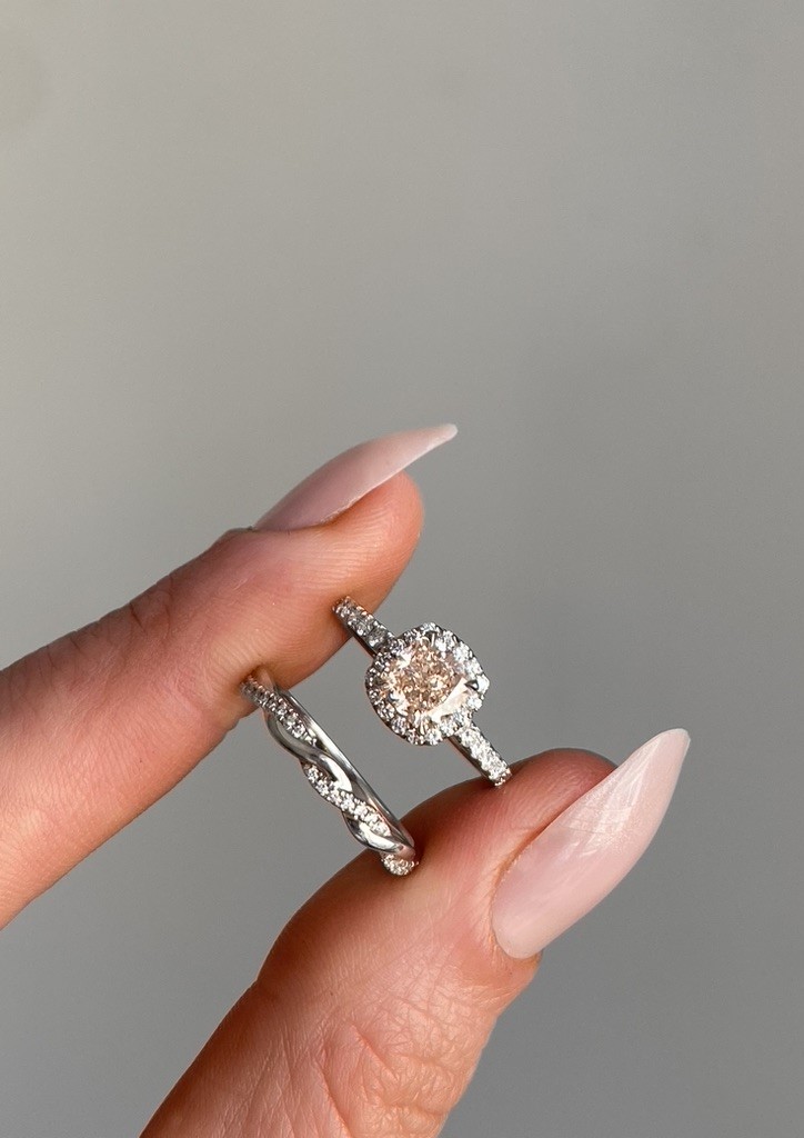 Coloured stones instantly add character. A green emerald side stone, a champagne diamond, a soft pink or a bold yellow — each one tells a different story without saying a word.